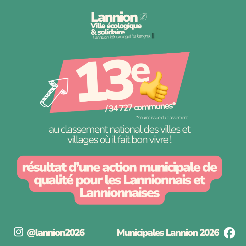 Et 4e dans la catégorie 20 000-50 000 habitants. C’est le résultat d’un travail collectif : collectivités, entreprises, associations, citoyens… et d’une action municipale efficace et de qualité au service de tous les Lannionnais. Ensemble, poursuivons le travail !
